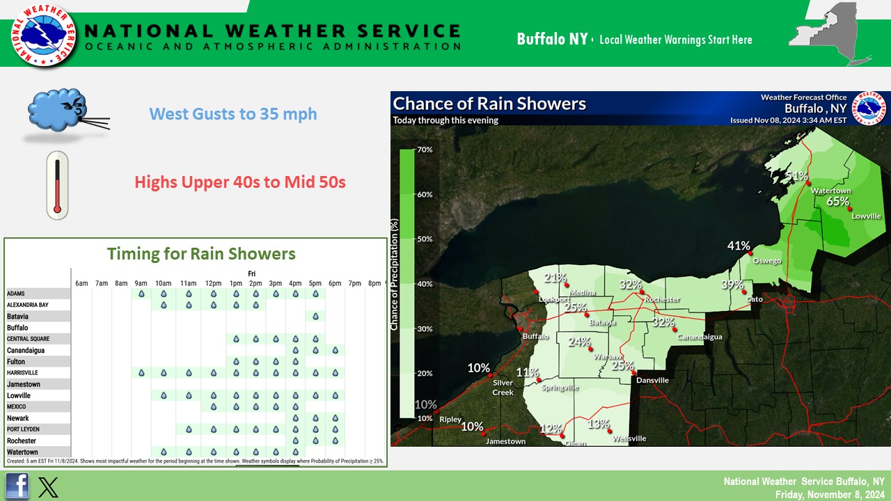 The National Weather Service in Buffalo, NY has issued a weather report for November 8, 2024, at 3:34 AM EST. A cold front is moving southeast, bringing rain showers primarily to central and eastern regions.