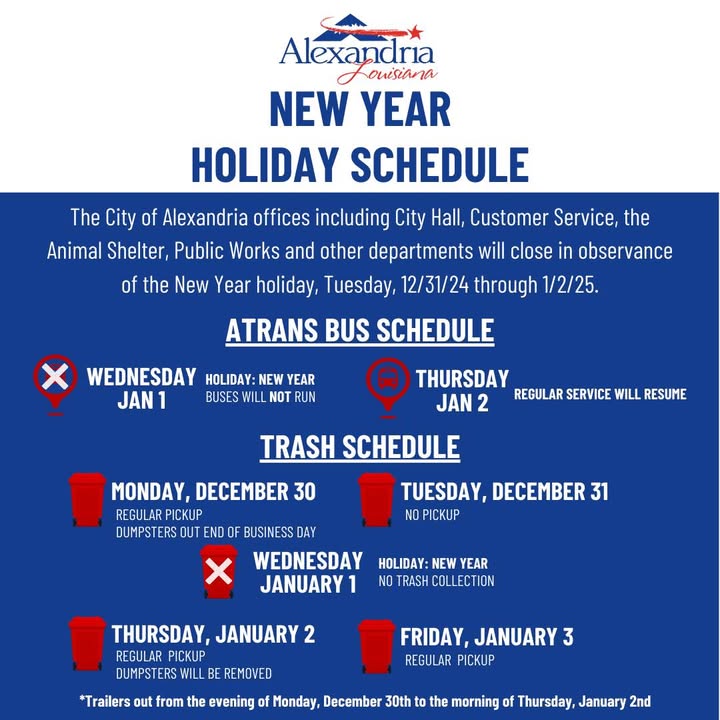 The City of Alexandria, Louisiana, has announced changes to office hours, sanitation services, and bus schedules in observance of the New Year holiday. Full details are as follows: