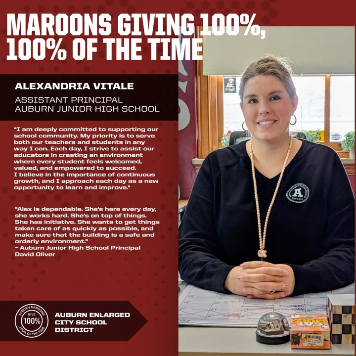 Auburn Junior High School Principal David Oliver described Vitale this way: “Alex is dependable. She's here every day, she works hard. She's on top of things. She has initiative. She wants to get things taken care of quickly as possible, and make sure that the building is a safe and orderly environment.”